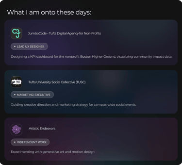 I’m a UX-focused designer currently pursuing a combined-degree in Engineering Psychology/ Human-Factors Engineering (BS) and Studio Art (BFA) at Tufts University and the SMFA (School of Museum of Fine Arts), graduating in December 2026.