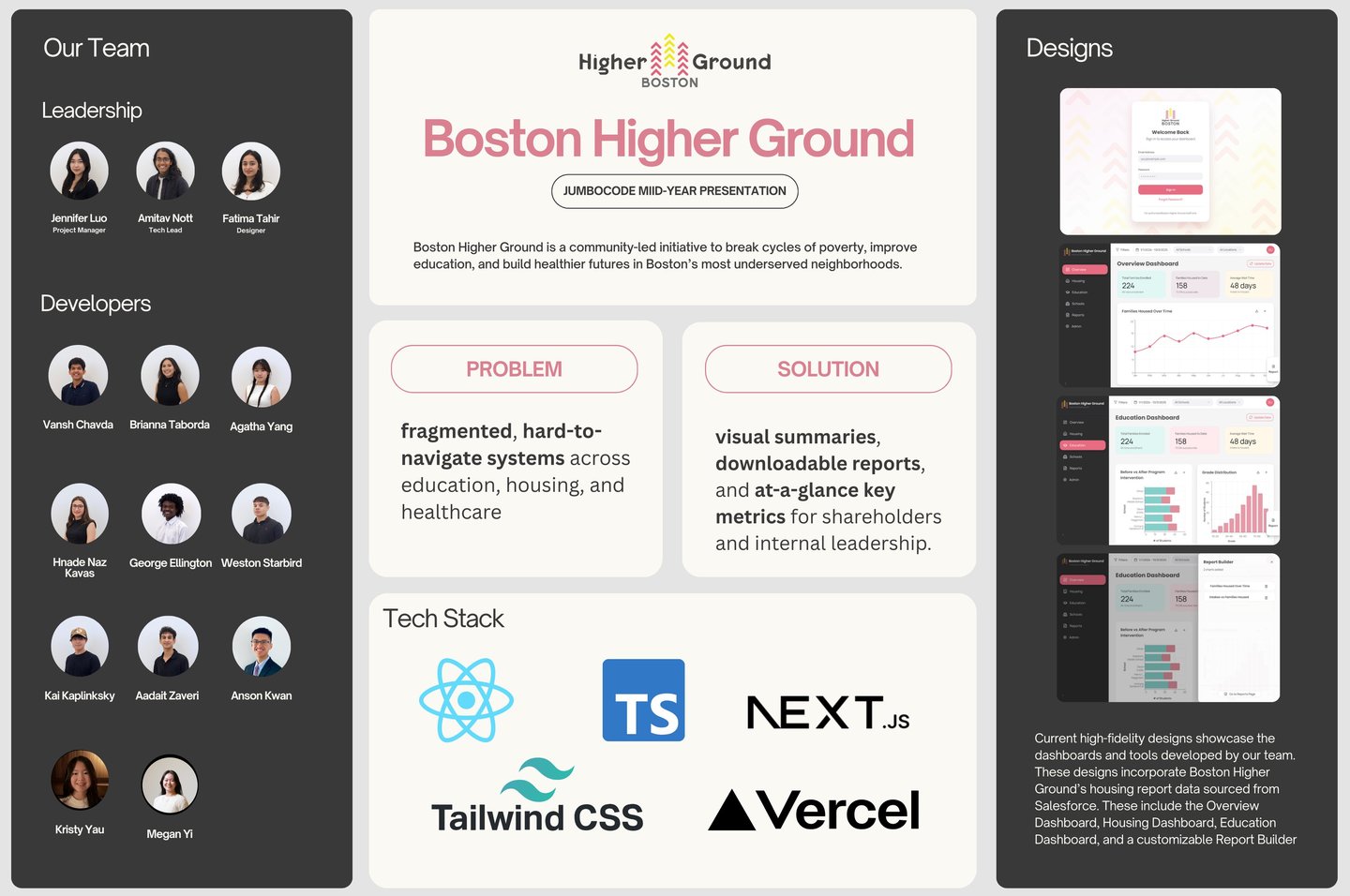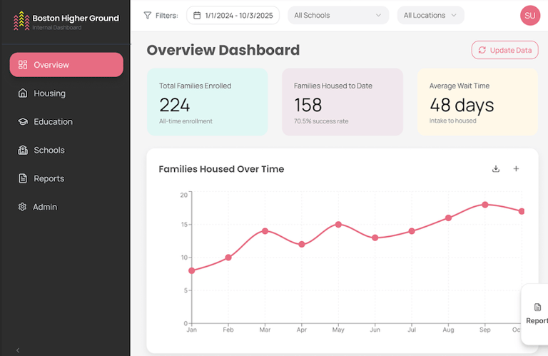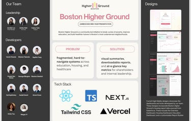 As a Designer for JumboCode, a student-run development organization at Tufts University, I collaborated with a development team to design a comprehensive data visualization platform, Our client, Boston Higher Ground, is a nonprofit focused on improving housing and education outcomes.